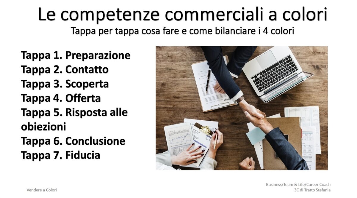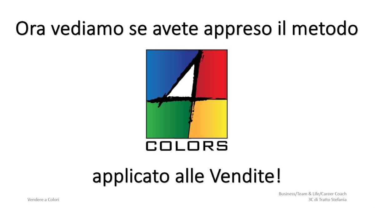 Il Corso "Vendere a Colori" si divide in 2 incontri da 4 ore ciascuno, di cui il primo incontro coincide in toto col Corso Base, che può essere seguito da tutti i collaboratori dell’azienda, dove si apprende il metodo 4Colors® appunto dalle basi, che è quindi propedeutico al secondo incontro che va ad approfondire nello specifico l’uso del metodo 4Colors® nell'area Commerciale.